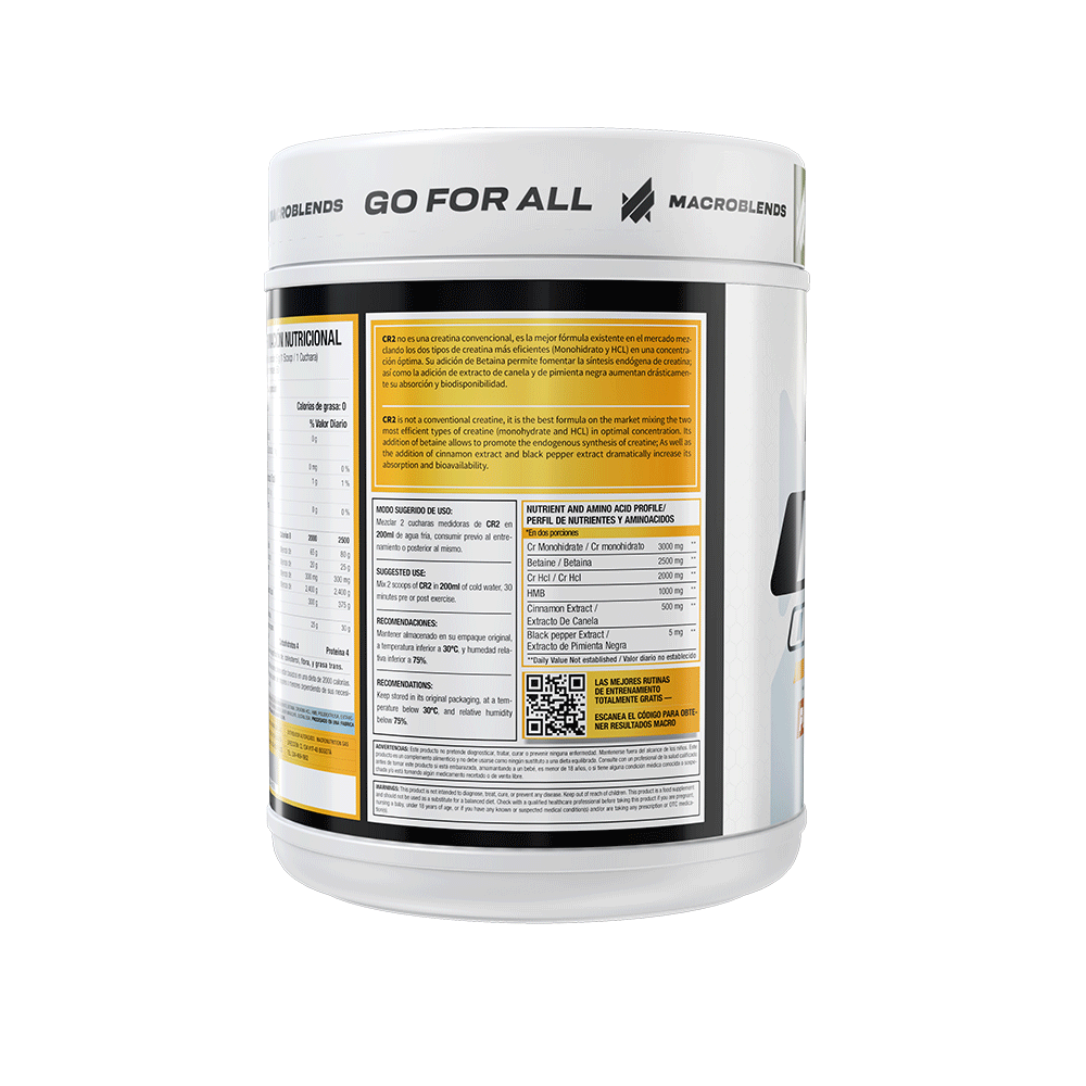 CR2 es una mezcla de creatinas (Monohidrato y HCL) 5gr. Adición de Betaína así como de extracto de canela, HMB y de pimienta negra.